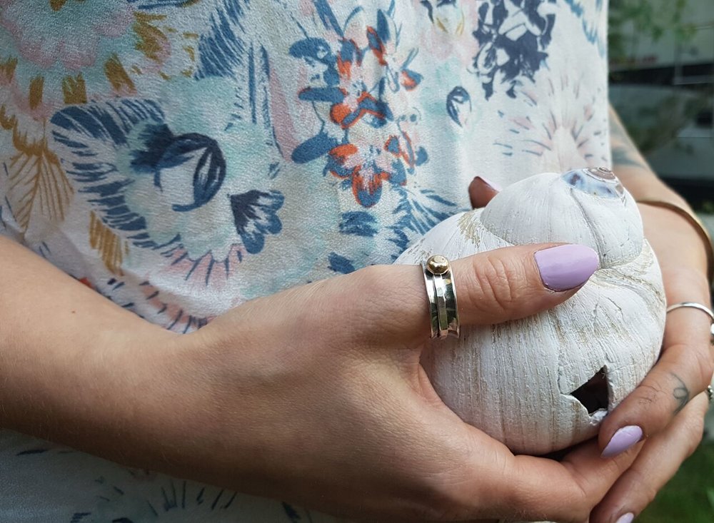 Sterling silver bands with 14 karat gold dot on outer band. Outer band is free moving allowing it to spin.