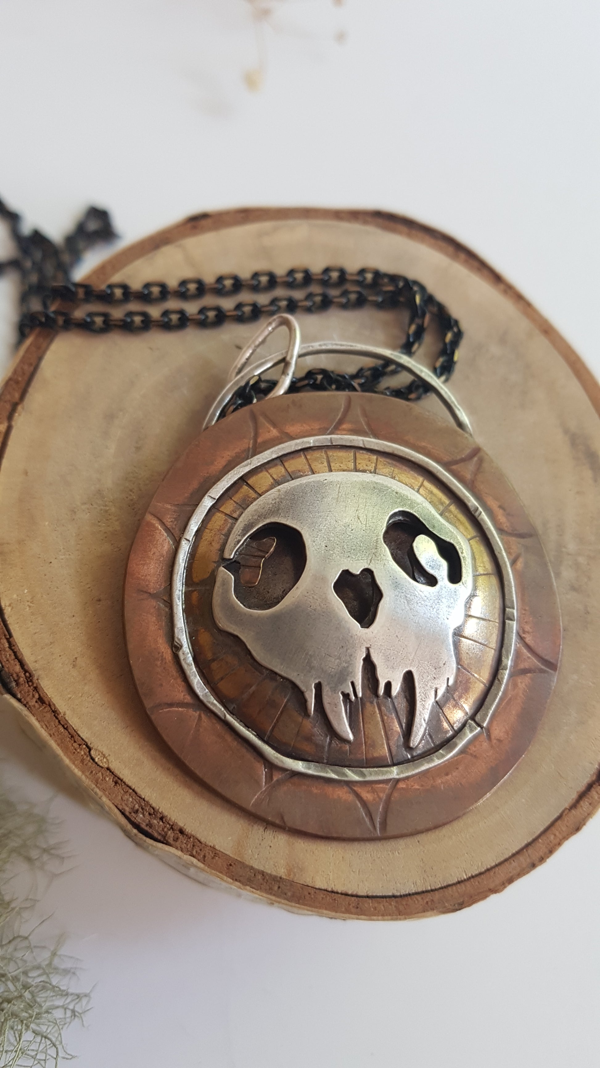 Mixed metals of copper, bronze and sterling silver. Hung on 28 inch blackened bronze chain.